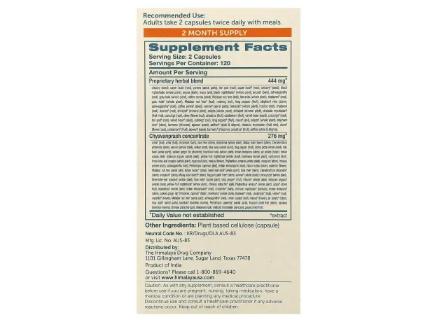 Запатентованная травяная смесь: цикорий (семена), каперсы (корень), тысячелистник (надземные части), стручки тери (корень), каперсы (корень), цикорий (семена), черный паслен (все растение), арджуна (кора), мускатный орех (арил), черный паслен (все растение), ашваганда (корень), готу кола (все растение), кофейная сенна (семена), малабарский орех (листья), тамариск (все растение), шатавари (корень), готу кола (все растение), малабарский орех (листья), мускатный орех (орешек), длинный перец (плод), слоновая лоза (стебель), ашваганда (корень), кофейная сенна (семена), тысячелистник (надземные части), тамариск (целое растение), лакрица (корень), шатавари (корень), лакрица (корень), мумие (минеральная смола), эклипта (целое растение), мумие (минеральная смола), миробалан (кожура плодов), куркулиго (корень), гвоздика (бутон цветка), целаструс (плоды), кардамон (плоды), бархатные бобы (семена), куркулиго (корень), стручок тери (корень), бархатная фасоль (семя), мускатный орех (орех), длинный перец (плод), мускатный орех (арил), эклипта (целое растение), слоновая лоза (стебель), куркума (корневище), аджован (семена), шафран (плоды и рыльца), миробалан (кожура), гвоздика (бутон), кардамон (плоды), аджован (семена), куркума (корневище), целаструс (плоды), шафран (плоды и рыльца). |