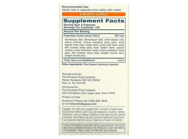Запатентованная смесь растительных экстрактов: дидимокарпуса (листья), зимней бегонии (корень), циперуса (корневище), оносмы прицветной (надземные части), зимней бегонии (корень), индийской марены (стебель), цветков колючей травы (семена), вьюнка (все растение), Марена индийская (стебель), циперус (корневище), цветок шиповника (семена), оносма прицветная (надземные части), ракитник (все растение целиком), мумие (минеральная смола), мумие сладкое (минеральная смола). |