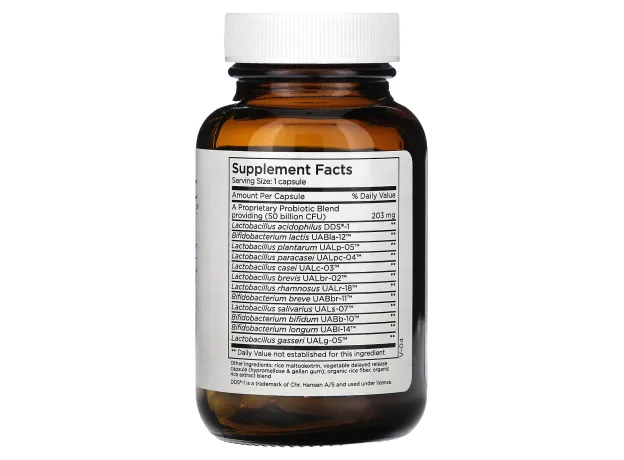 | Проприетарная смесь пробиотиков: Lactobacillus acidophilus DDS®-1 Bifidobacterium lactis UABla-12™ Lactobacillus plantarum UALp-05™ Lactobacillus paracasei UALpc-04™ Lactobacillus casei UALc-03™ Lactobacillus brevis UALbr-02™ Lactobacillus rhamnosus UALr-18™ Bifidobacterium breve UABbr-11™ Lactobacillus salivarius UALs-07™ Bifidobacterium bifidum UABb-10™ Bifidobacterium longum UABI-14™ Lactobacillus gasseri UALg-05™ | 203 мг (50 млрд КОЕ) | ** |