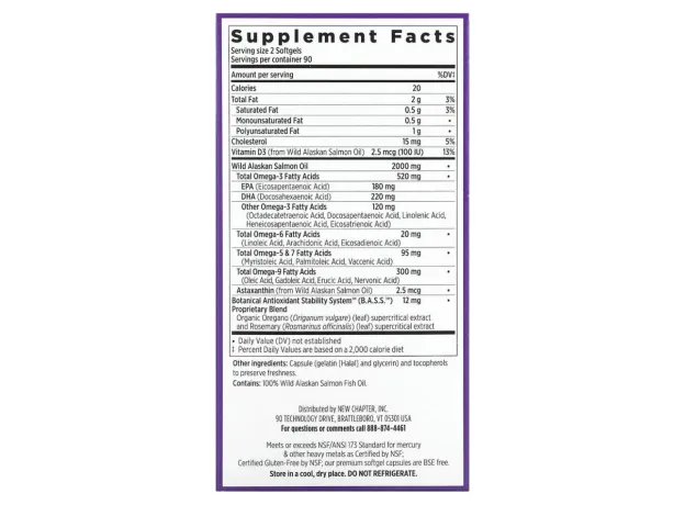 | Витамин D3 (из масла дикого лосося) | 2,5 мкг (100 МЕ) | 13% |